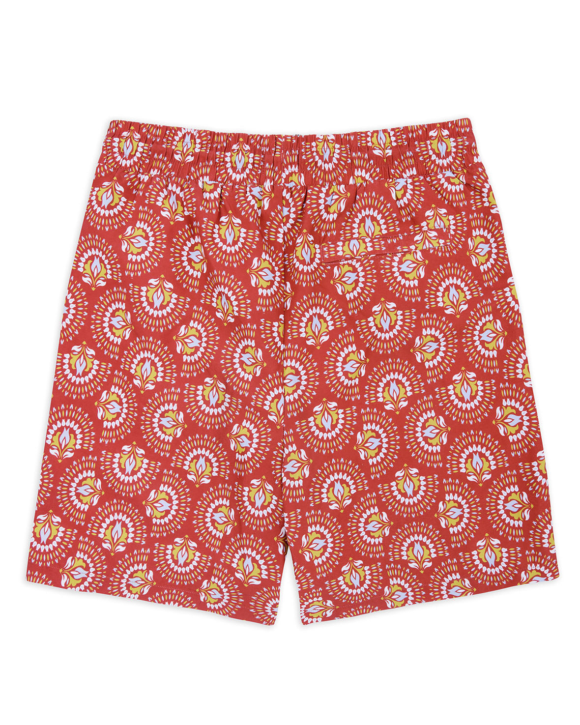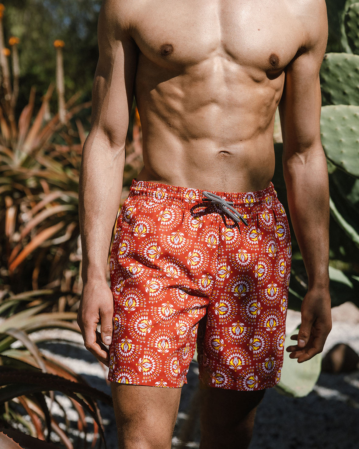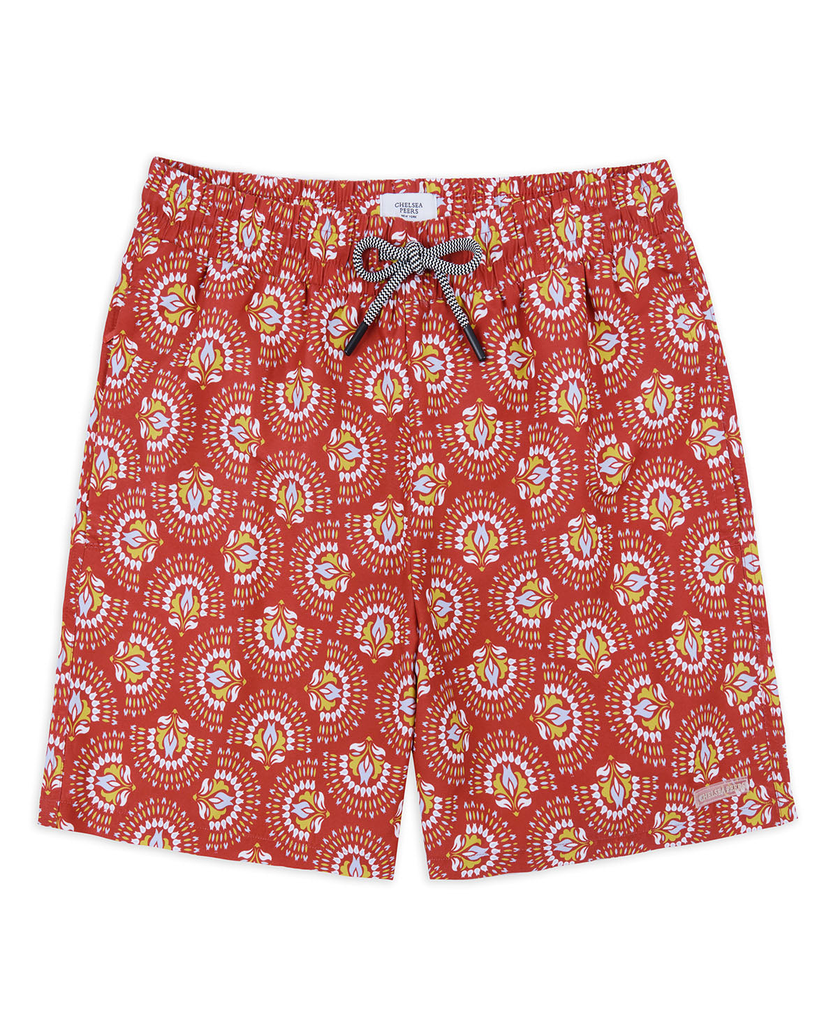Made from our signature planet conscious recycled swim fabric, these relaxed fit swim shorts are printed with hand-drawn fan design.