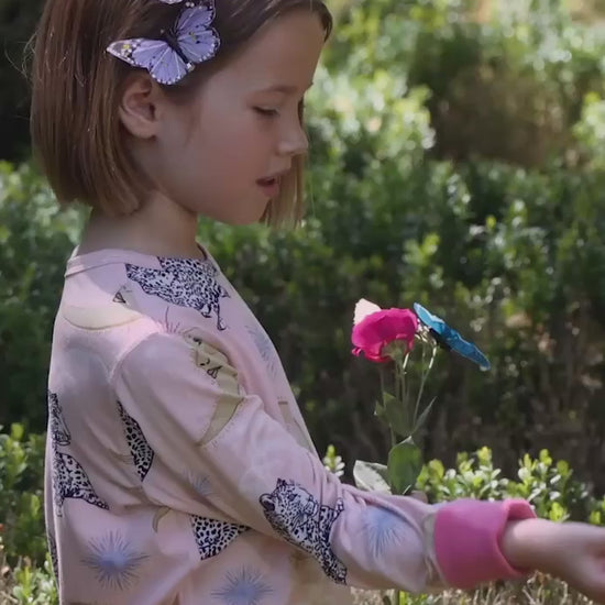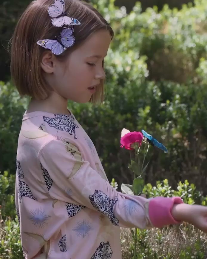 Make bedtime magical with our Celestial Leopards kids pyjama set. On a dreamy pale pink base, playful white leopards prowl amongst golden smiling moons, fluffy clouds and twinkling stars, creating a print that feels straight from the night sky. The round crew neck top with long sleeves is paired with matching long bottoms, designed with a comfy elasticated waist and clever 'grow-with-me' cuffs so little ones don't grow out of them too fast. A tagless design keeps things sensory-friendly, while the recycled fibre jersey fabric is soft enough for sweet dreams and endless adventures.