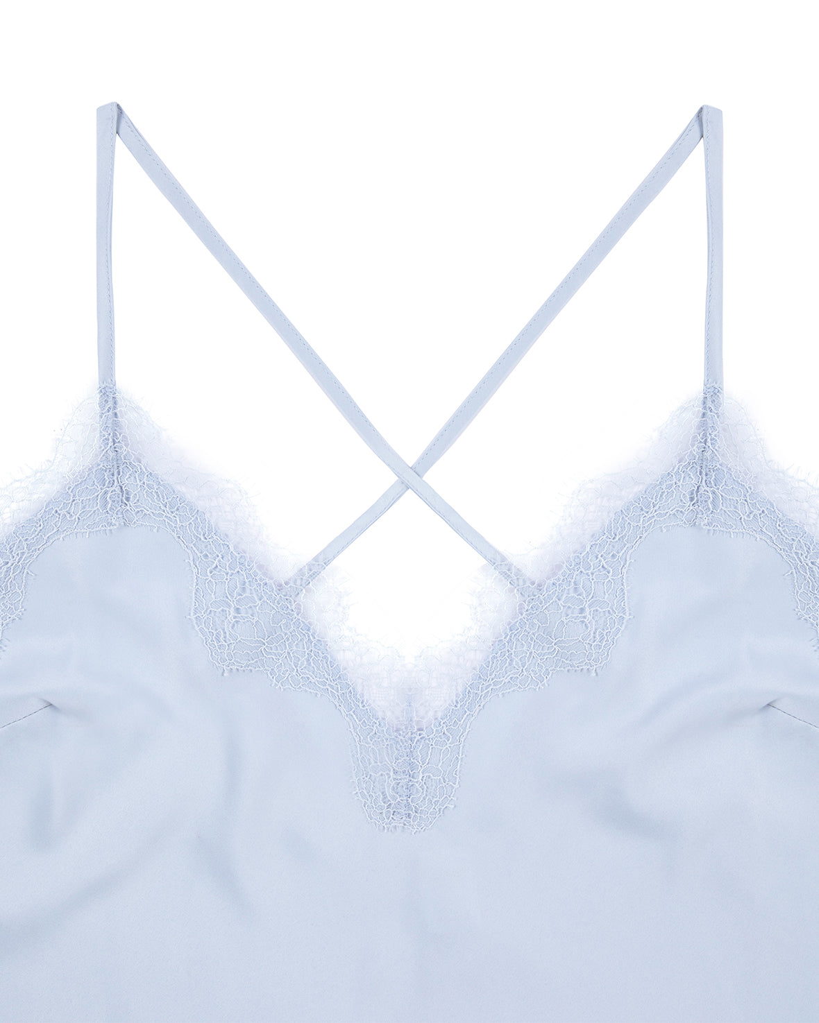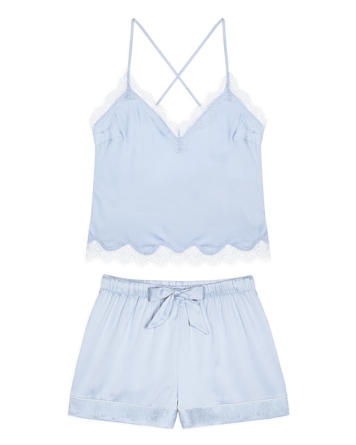 In fresh cornflower blue satin and beautifully finished with an intricate eyelash lace trim edging, this sensual short pyjama set pairs a delicate cami top with French knicker inspired shorts.
