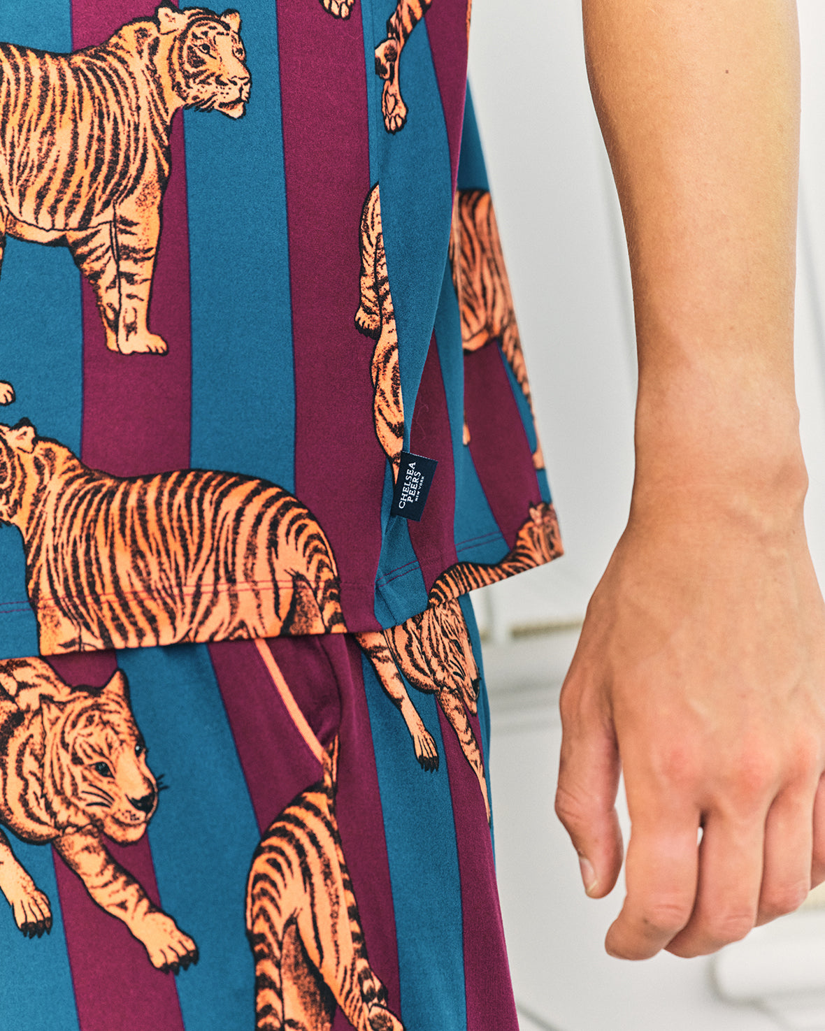 Unwind in style with this tiger-striped pyjama set, featuring a rich burgundy and blue design with hand-drawn big cats on the move. The short-sleeved shirt is cut with a revere collar and chest pocket, while the relaxed bottoms are finished with an elasticated waistband and side pockets. Made from soft recycled fibres jersey for next-level comfort, night or day.