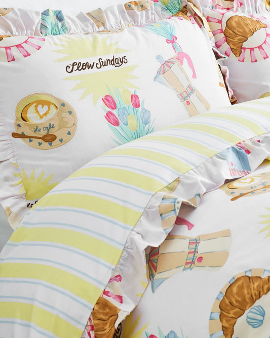 Wake up to the sweetest start with this playful bedding set, scattered with hand-drawn croissants, coffee cups, pots of jam, honey, and fresh berries, everything you need for the perfect petit déjeuner. Flip it over to reveal a softer side in crisp white dotted with dusky pink polka dots, for a look that's just as charming as it is versatile. Crafted in 100% cotton, it's soft, breathable, and perfect for long, lazy mornings in bed with your favourite brew. Bon appétit!