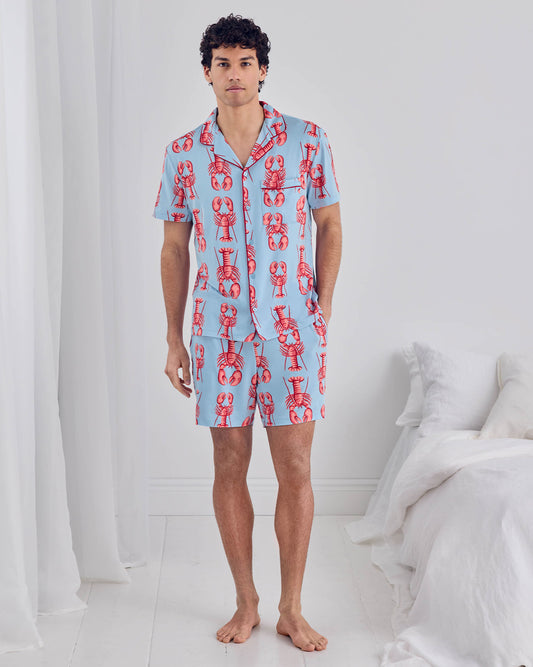 With its playful fish print this short pyjama set brings a sense of fun to your wind-down wardrobe. The hand-drawn design features blue fish gliding through bold dark red and cream stripes, a nod to laid-back days and coastal escapes.The revere collar shirt pairs with matching shorts, finished with contrast piping, an elasticated drawstring waist and side pockets for easy comfort. Made from soft 95% recycled fibre jersey, it's your go-to for slow mornings and warm, sleepy nights. Because the best kind of catch? Gone fishing, be home for lounging.