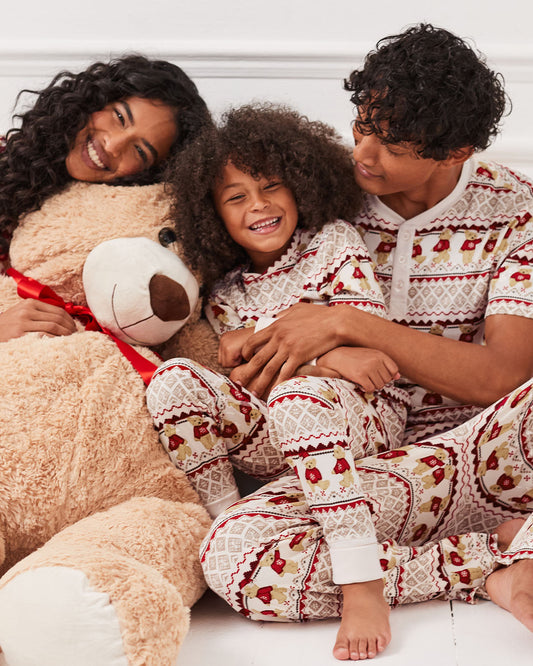 Celebrate the season in softer tones with this beige and cream gingham pyjama set, embroidered with Peers the bear in his favourite festive knit. Woven from 100% certified organic cotton with a soft brushed finish, the revere collar shirt and elasticated bottoms are finished with contrast red piping for a polished seasonal look. Comfortable, breathable and endlessly giftable, it's the perfect set for festive nights in and Christmas mornings alike. Classic neutrals meet cosy charm.