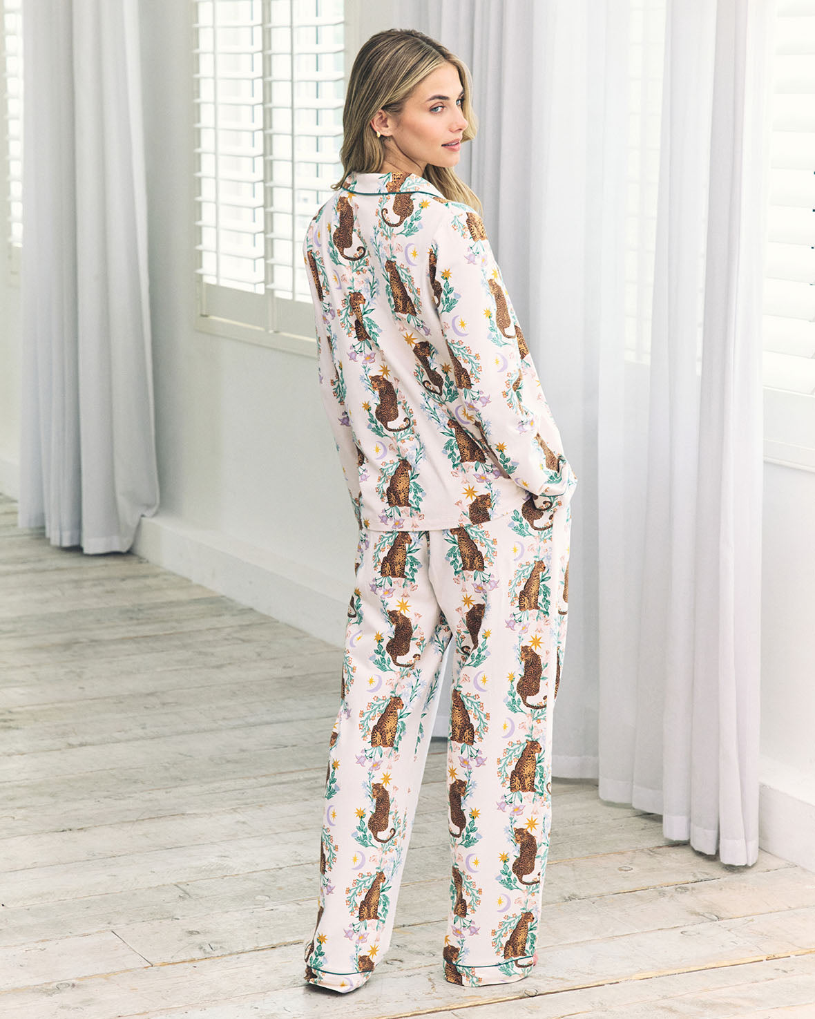 In our soft, certified organic cotton fabric, this long pyjama set pairs a classic button-up long sleeve shirt with elasticated waist long bottoms in an iconic new print. Hand-drawn by our team of talented artists, our signature leopard nestles in amongst a bed of blooming flowers, with a delicate moon and stars the finishing touch.