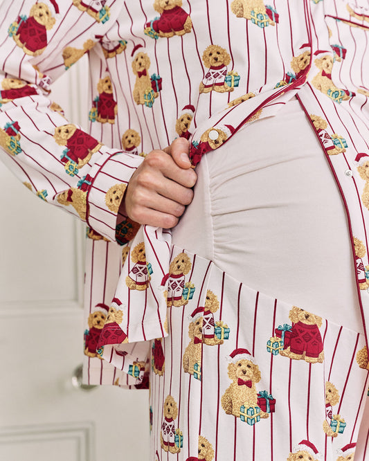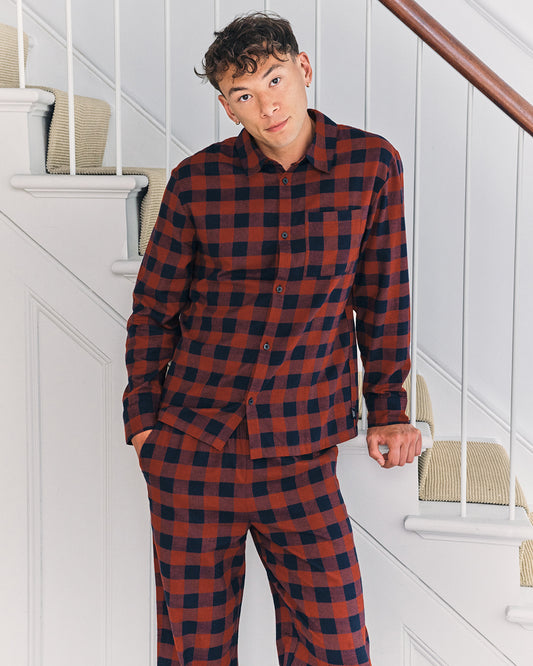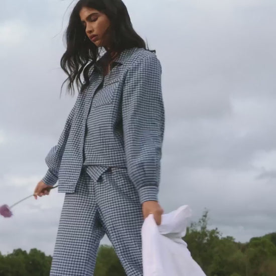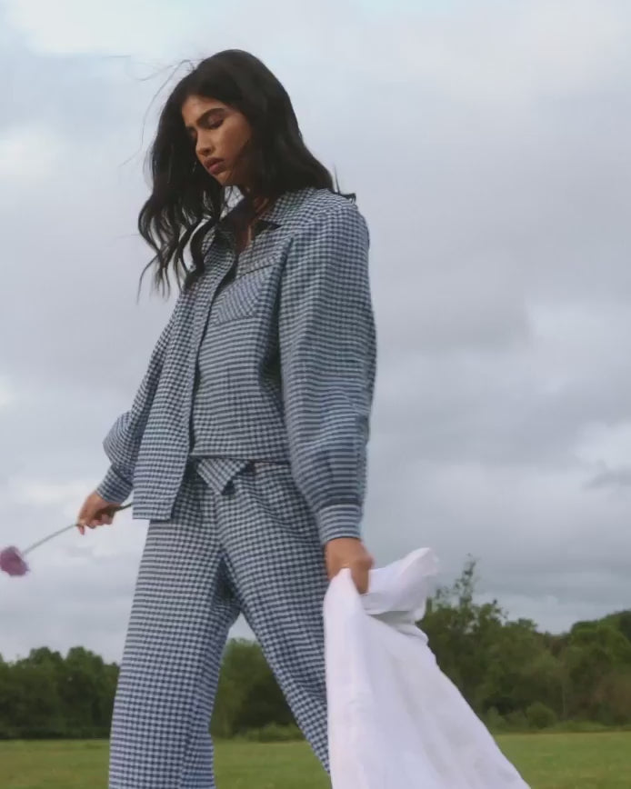 Crafted from 100% certified organic cotton, this gingham pyjama set serves timeless style with a playful twist. The classic button-up shirt and straight-leg trousers come in soft navy and blue check, finished with contrast piping for that polished feel. And the best bit? It comes with a matching French knot-style scrunchie perfect for tying your hair back during your beauty routine, or just popping on for a cute finishing touch. Effortlessly soft, seriously stylish your wind-down wardrobe just got an upgrade.